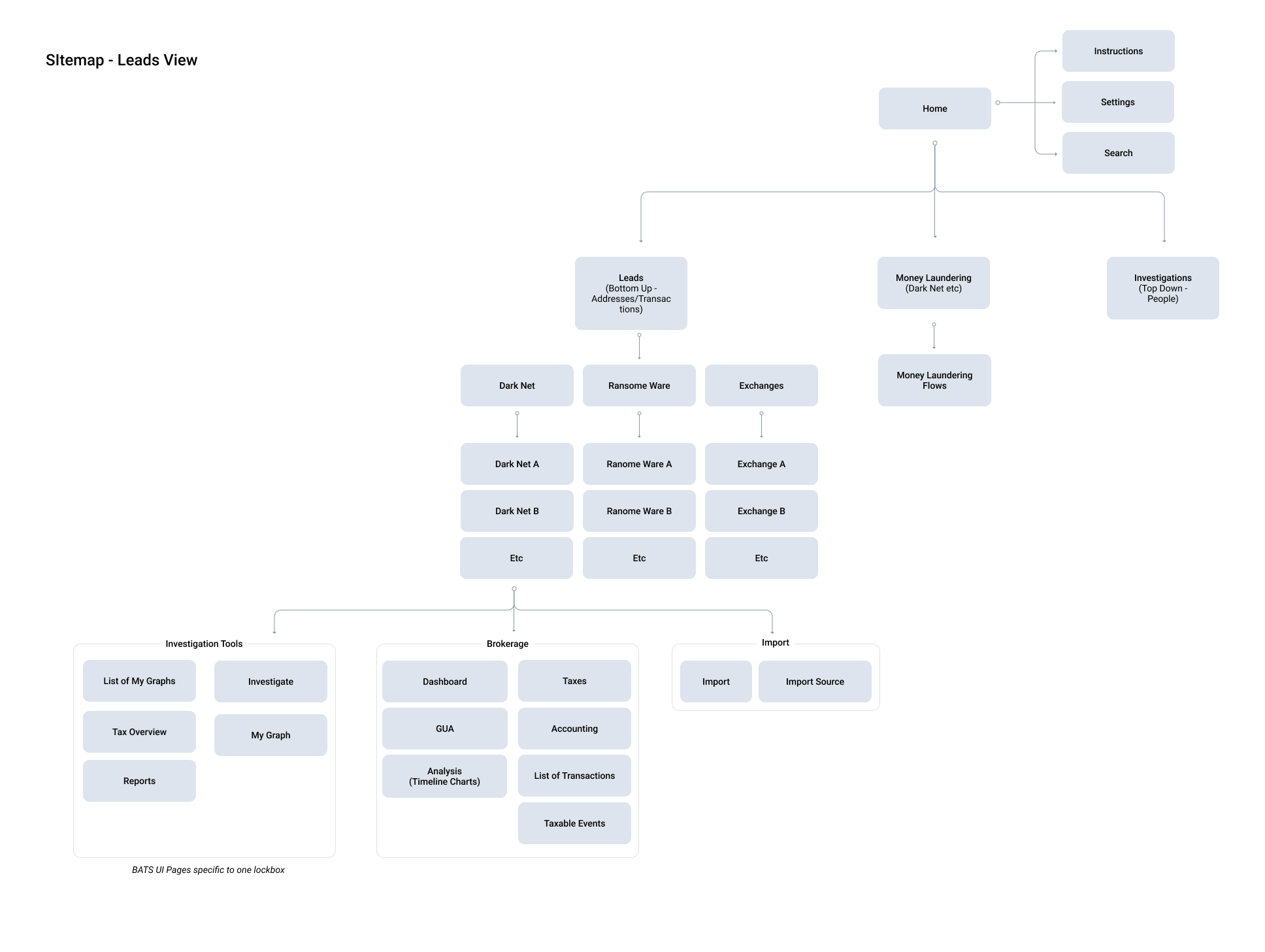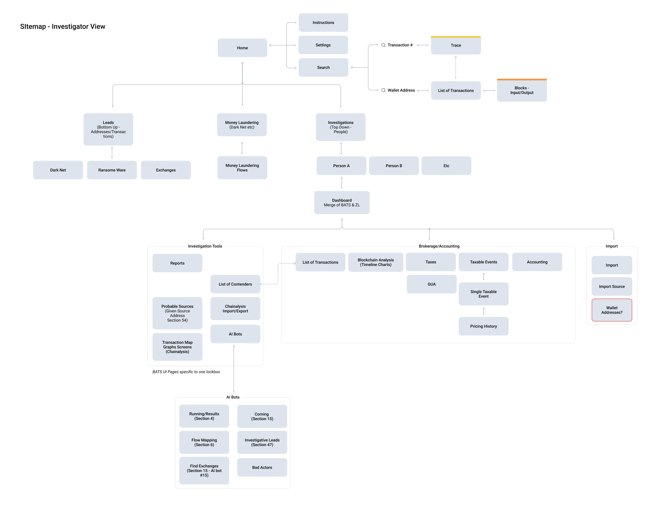 Sitemap showing the bottom up flows, where an investigation starts with an address or transactions.